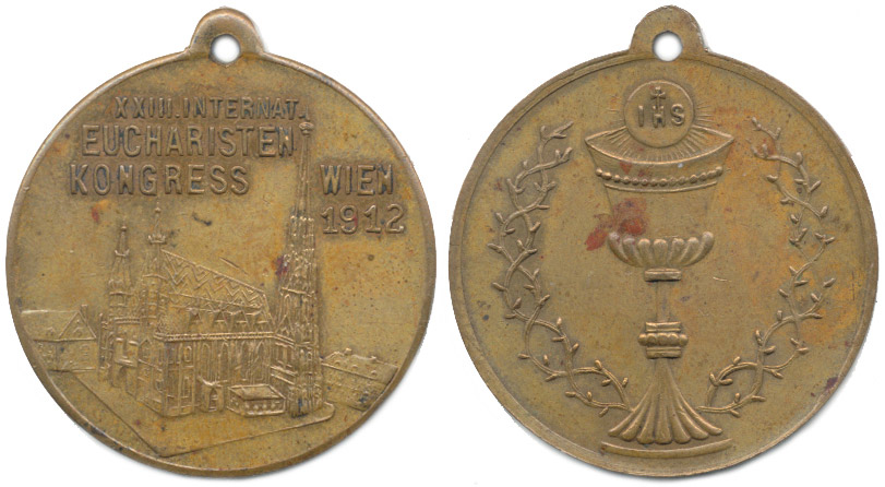Nesign. - XXIII. mezinárodní eucharistický kongres, 1912 Chrám sv.Štěpána, 4řádk.nápis / kalich ve věnci Mosaz 33 mm_orig.raž.ouško