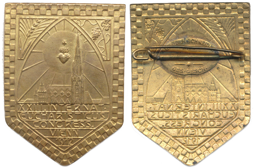 Nesign. - XXIII. mezinárodní eucharistický kongres, 1912 Chrám sv.Štěpána v gotickém oblouku, 5řádk,.něm.nápis Mosaz.odznak 34x46,5 mm_připínací se signaturou Br.Schneider Wien