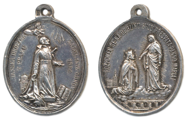 Praha 1575/1880 - klečící Jan Nepomucký před Pannou Marií, opis / stojící blahoslavený Edmund Kampian, český opis Nesign., Ag 29x33 mm, 13.21 g, Gr.1286_orig.raž.ouško