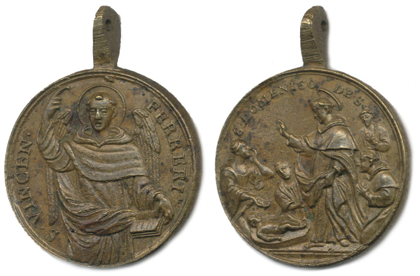 Svatý Vincent Ferrerský s andělskými křídly, opis / Svatý Dominik křtí jako misionář pohanské dítě, opis Bronz 34 mm, Gr.340_orig.ouško