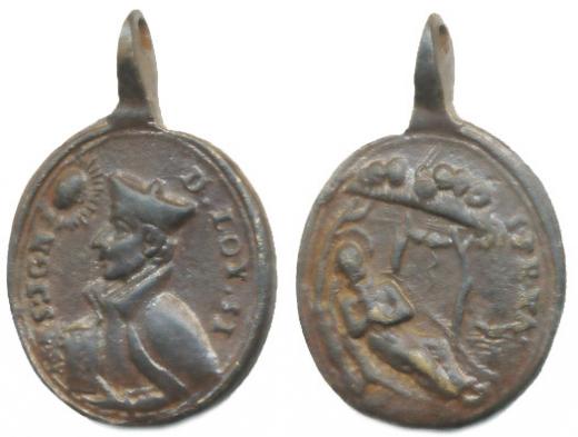 Jezuité - barokní medaile z 18.stol. - svatý Ignác z Loyoly - umírající svatý František Xaverský, b.l., poprsí zprava, opis poprsí světce s květinou, Mosaz 23,5x26,5 mm_orig.kolmé ouško