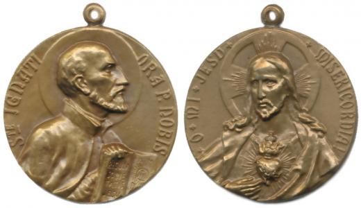 Jezuité - sv.Ignác z Loyoly - medaile b.l. (1.pol.20.stol.) Poprsí světce s knihou zprava, opis / poprsí Krista - Božské srdce Páně, opis, Bronz 31,5 mm_orig.raž.ouško