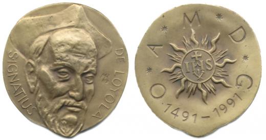 Jezuité - sv.Ignác z Loyoly - medaile k 500.výr.narození 1991 Hlava světce čelně, opis / zářící znak Jezuitského řádu, opis Sign.MR (Mikuláš Rutkovský), Bronz 39x42 mm
