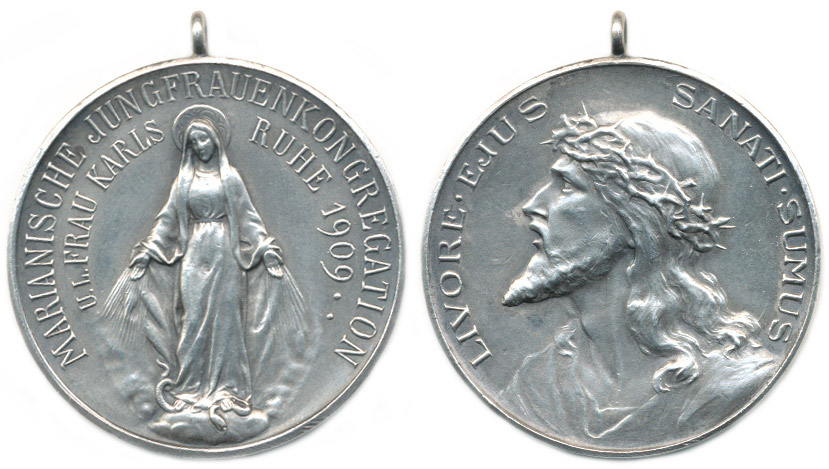 Mariánská kongegace mladých paní - Karlsruhe 1909 Panna Maria Immaculata stojící na hadovi a zeměkouli, opis / hlava Ježíše Krista zleva s trnovou korunou, opis, Nové stříbro 34 mm 14,92 g_orig.kolmé ouško
