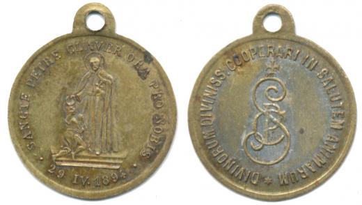 Jezuité - medaile Solidarity misijních sester sv.Petra Clavera /zal.1894), stojící sv.Petr Claver, lat.opis / ozdobný monogram SPC s křížem, lat.opis, Mosaz 18 mm_orig.raž.ouško