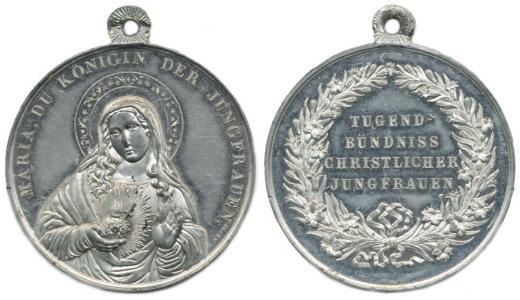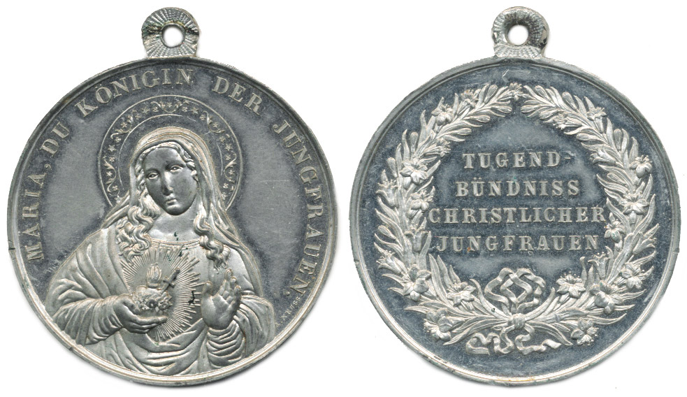 A.Neuss - Spolek ctnostných křesťanských panen, b.l. Polopostava Panny Marie, něm.opis / 4řádk.mápis v liliovém věnci Sign., Al 40 mm, 23,5 g_orig.raž.šrafované ouško