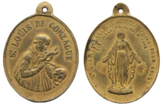 Jezuité - svatý Alois Gonzaga, opis / zvěstování Panně Marii, francouzský opis 1830, Mosaz 30x35 mm_orig.raž.ouško