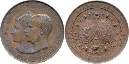 Ed.Geerts - svatební medaile 10.5.1881 Dvojportrét zleva, francouzský opis / 2 znaky ve věnci, franc.opis Sign., Bronz 32 mm, Haus.376_R!