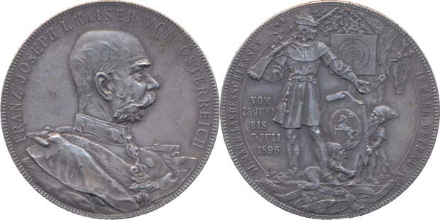 Pawlik - Moravská Ostrava - VI.moravské zemské střelby 1896 Portrét FJI zprava, opis / střelec s puškou u stromu s terčem, nápis, opis, Sign., 2x Punc., Ag 35 mm, 22.28 g_tém.