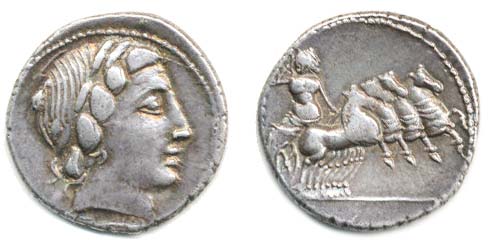 AR denár, Hlava Apolóna doprava / Jupiter v quadrize, S.229, Crawford.350A/2_tém.