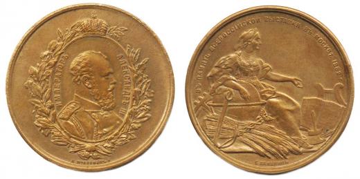 Alexandr III. - všeruská výstava v Moskvě, 1882 Korunované poprsí zprava ve věnci, opis / sedící žena s výstavními symboly, Sign.S.Važenin, L.Steinmann, Bronz 46 mm_tém.