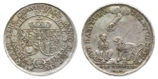Ch.Maler - pamětní medaile na korunovaci krále a královny, 1619 korunované dva znaky, dvojitý opis / lev čelně a lev zleva, nápis v úseči, opis, Ag 32.5 mm, 14.26 g, Don.2029, ČS.384_RR!
