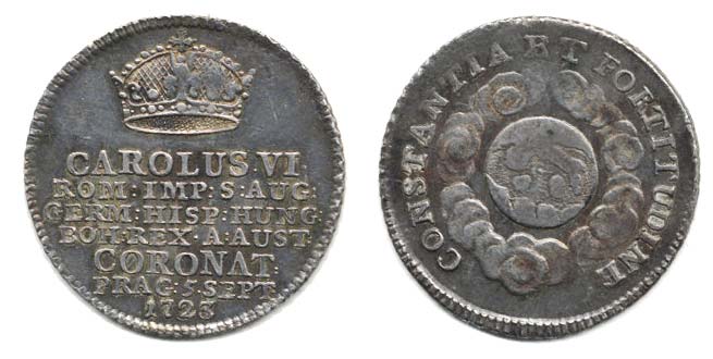 Větší peníz na korunovaci v Praze, 5.IX.1723 Koruna, nápis / zeměkoule v oblacích, opis, Nesign., Ag 24 mm, 4.5 g, ČS.1110, M.1579, Nov.III/Z-6b