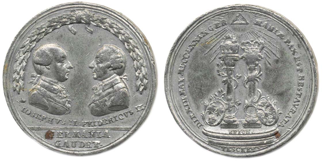 Reich - medaile na těšínský mír 1779 dvojpotrét císaře Josefa II a Fridricha II, opis / 2 korunované sloupy, opis, v úseči Cu stift, Sn 46 mm, 30,39 g, Ho.3149, We.8197, LG.XIV/295, SD.-