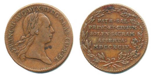 Menší peníz na holdování v Belgii (Brusel) 1794 Portrét zprava, opis / 5řádk.nápis Bronz 22 mm, Nov.XVII/M-6c, LG.XIV/1219, Mont.-_R!