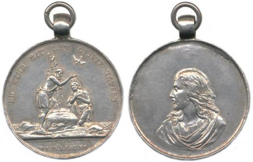 H.Lorenz - křestní medaile b.l. (cca 1815) Poprsí Krista zleva / sv.Jan křtí Krista v Jordánu, nad nimi holubice, symbol Ducha svatého, 2řádk.něm.nápis v úseči, něm.opis, Sign., Ag 36 mm, 14,72 g, Gr.1384 pod._kolmé soudkov. ouško tém.