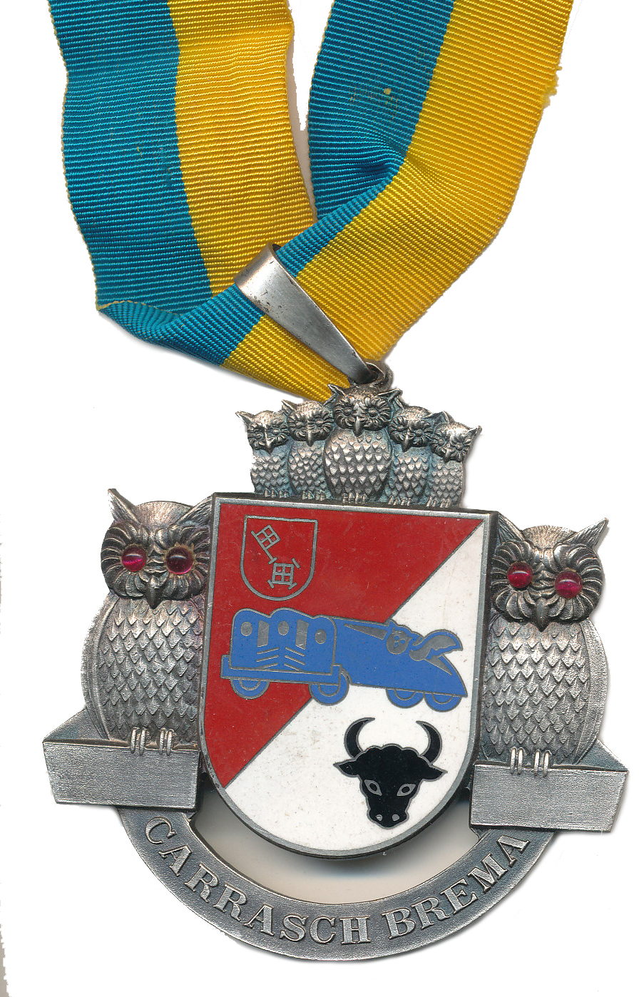 Brémy (Brema) - řád, smaltov.znak s automobilem převyšuje 5 výrů, výři po stranách drží stuhu s opisem CARRASCH BREMA Bílý kov 71.5x70 mm_ouško se závěsem a nákrční stuhou