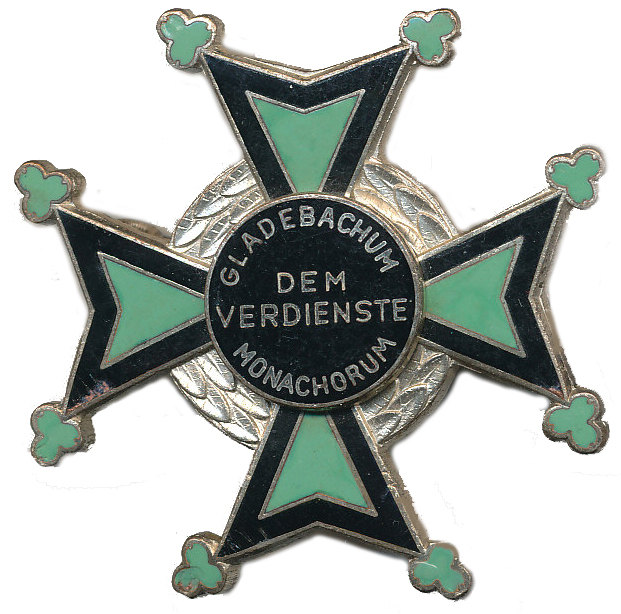 Gladbach (Gladenbachum Monachorum) - Záslužný kříž, stříbrný zeleně smaltov.černě rámovaný s věncem mezi ramerny, černý střed s nápisem DEM / VERDIENSTE_vodorov.zavírací jehlice