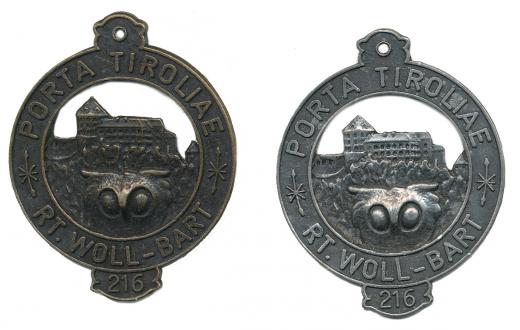 Kufstein (Porta Tiroliae) - odznak - v kruhovém poli pevnost, výří hlava, opis v okruží PORTA TIROLIAE * RT.WOLL-BART / 216 Postř.bronz.odznak 45 mm, Bronz.odznak 45 mm_ouško 2 ks