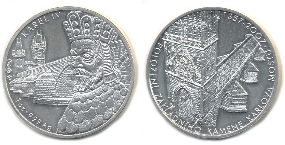 Nesign. - položení základního kamene Karlova mostu 1357 - 2007 Poprsí Karla IV. zleva, v pozadí Karlův most, opis / Mostecká brána a Karlův most, Nesign., Punc.na hr. 999, Ag 37 mm, 31,11 g (1 unce)