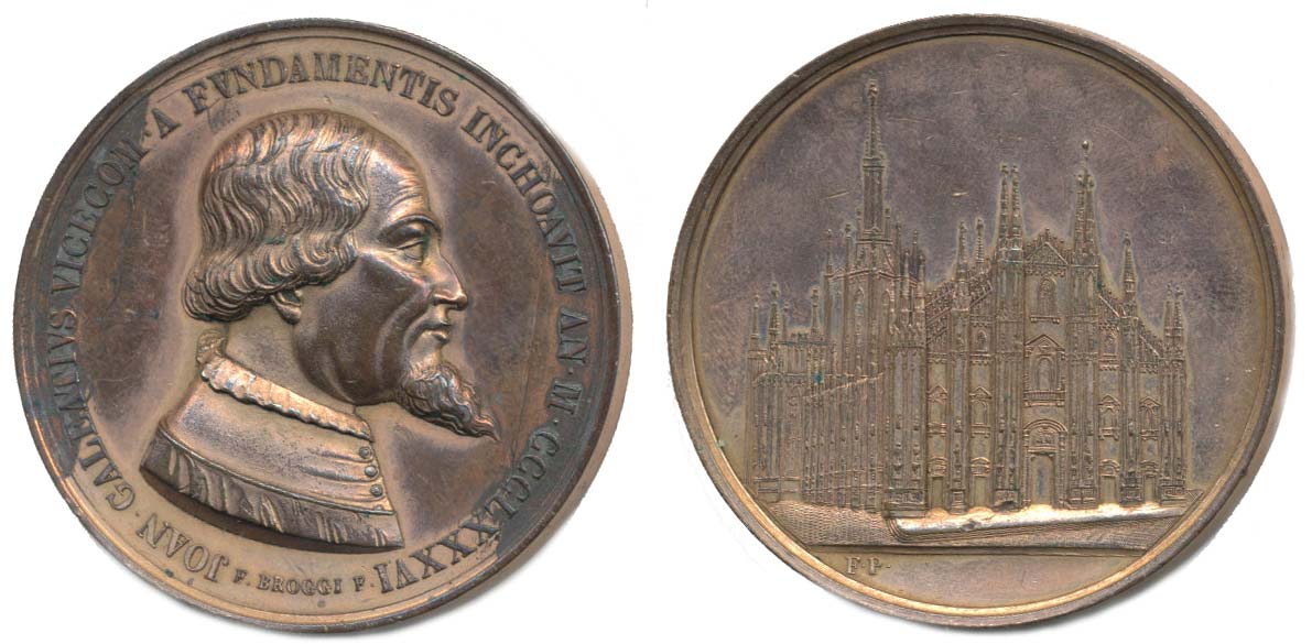 F.Broggi - medaile k 500.výr.zahájení stavby katedrály 1386 - 1886 Poprsí vévody J.G.Viscontiho zprava, opis / pohled na katedrálu Sign., Bronz 47 mm, 51,78 g_2x prasklý v ploše aversu