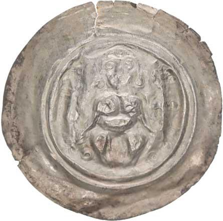 Velký brakteát - postava sedící na trůně čelně s mečem v obou rukách, Bonh.1935, Schw532a_dr.naprasklý