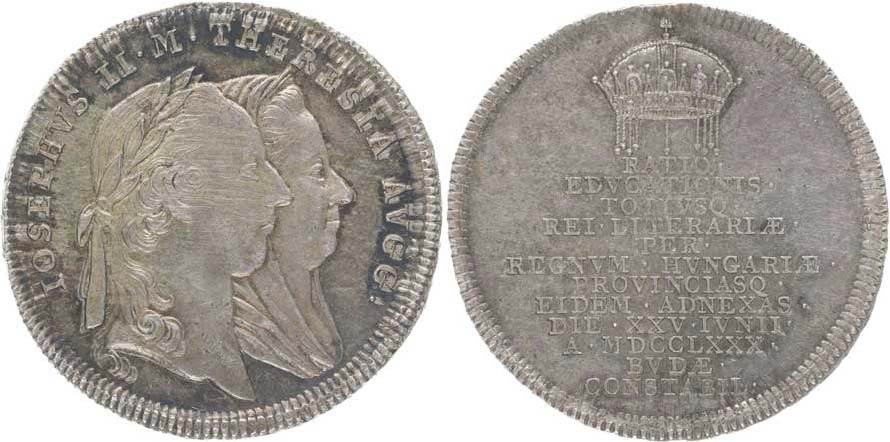Větší jeton na návštěvu v Budapešti 25.6.1780 v souvislosti se školskou reformou v Uhrách, dvojportrét zprava, opis / 12řádk. nápis, Nesign., Ag 26 mm, 3.96 g, Mo.2096, LG.XIV/301_n.just.