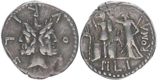 AR Denár, Janus, opis "FOVRI.L.F." / Roma stojící před trofejemi, nápis "ROMA.PHIL.", Crawford.281/1, S.179, Seaby.18, Ves.1075_dr.ned.
