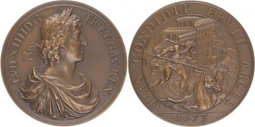 Ludvík XIV. (1638-1715) - medaile na dobytí Maastrichtu 1673 Poprsí zprava, opis / bojová scéna, latinský opis Nesign., Bronz 54 mm, 70,12 g_pozdější práce