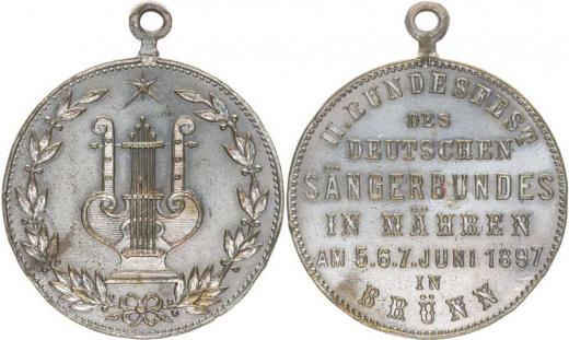 Brno (Brünn) - v upomínku na II. spolkovou slavnost 5.,6.,7.Juni 1897 Německý pěvecký spolek na Moravě - lyra ve věnci / 8řádk.nápis Nesign., Postř..med. 33 mm_orig.raž.ouško