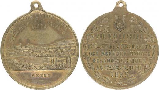 Brno (Brünn) - v upomínku na 25.výr.založení mužského pěveckého spolku 1885 pohled na město, 3řádk.opis / 9řádk.nápis ve věnci, lyra Pozlac.bronz 34 mm_orig.raž.ouško