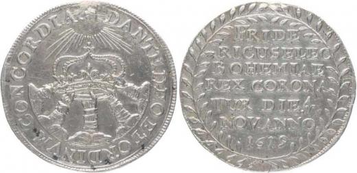 Velký peníz na volbu a korunovaci v Praze, 26.8. a 4.11.1619 Pět rukou drží korunu, sluneční paprsky, opis / 7řádk.nápis ve věnci, Ag 26 mm, 6,25 g, ČS.378, Don.2043, Nov.VI/A-7/b_dr.st. po ouško R!