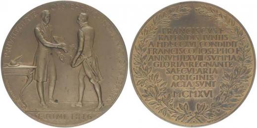 St.Schwartz - 100 let založení Rakouské národní banky 1816 - 1916 Císař František I. předává zakl.listinu, opis / 10řádk.nápis ve věnci Bronz 65 mm