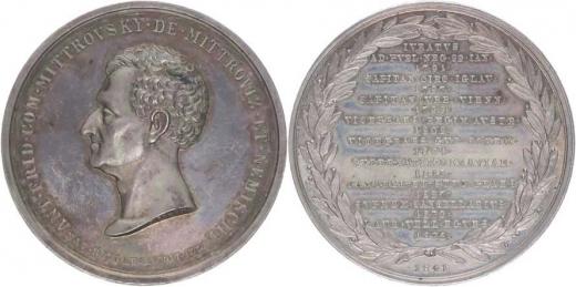 Životopisná medaile, 1841 ( od r.1815 morav.gubarnátor), 1841#Ag Hlava zleva, opis / ve věnci životopisná data, Sign.J.Schön, Nepunc., Ag 50 mm, 43,59 g, Mo.2847, Ho.7485, Do.3606, MZČ.139/5, MN.283