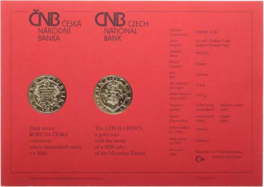 Karta (certifikát) pro minci 2500 Kč 1996 - tolar Moravských stavů