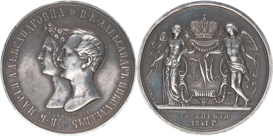 Marie Alexandrovna a Alexandr Nikolajevič (pozdější car Alexandr II.) Svatební medaile (rubl) z 16.4.1841, dvojportrét zleva, opis / korunovaná iniciála se dvěma alegorickými postavami, 2řádk.nápisv úseči, Sign.H.Gube (v va. a rev.), Ag 36 mm, 20,78 g, Bitkin.901,Diakov.563.3_RR!