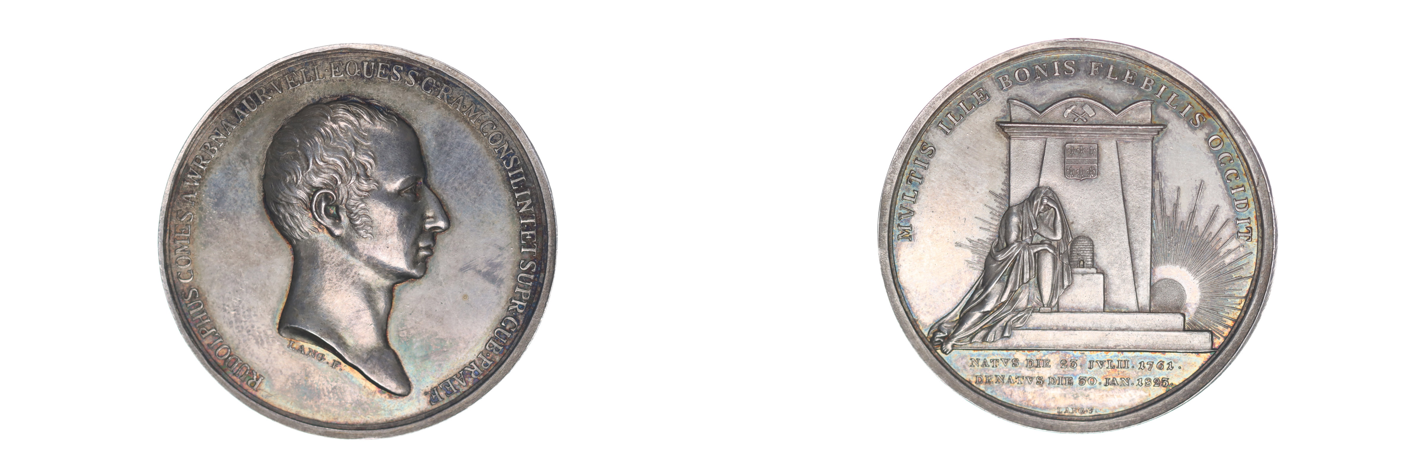 Lang. F. - úmrtní medaile, 1823 Poprsí zprava, opis / truchlící anděl u náhrobku, 2řádk.nápis, opis Sign., Ag 47 mm, 35,10 g, MN.653, Do.4052