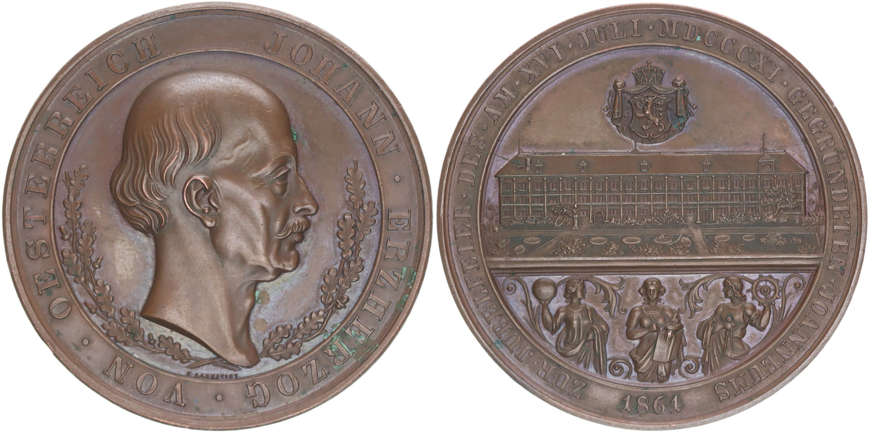 C.Radnitzky - jubilejní slavnost na 50.výr. založení Johannea v Grazu 1811 - 1861, poprsí arcivévody ve věnci zprava, opis / pod korunovaným štýrským znakem pohled na budovu, Bronz 50 mm