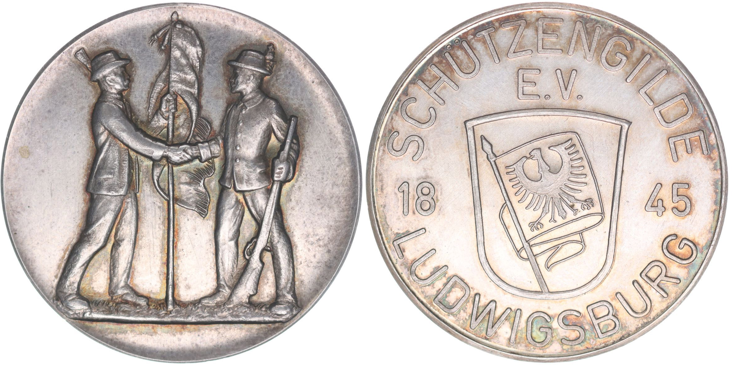 Německo - Ludwigsburg -medaile střeleckého spolku 1845, b.l. (1995) Dva stojící muži si podávají ruce před praporem / uprostřed znak, opis Nesign., Punc.935, Ag klipa 40 mm, 31,52 g