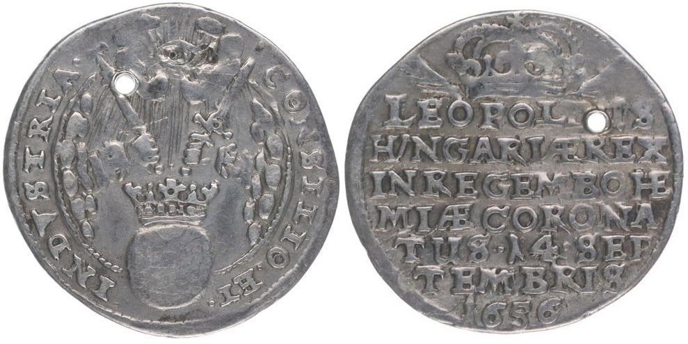 Střední žeton na korunovaci na českého krále v Praze 14.9.1656 7řádk.nápis pod korunou / pod božím okem drží dvě ruce žezlo a meč, Ag 21 mm, 1,98 g, Nov.IX/E-4b, Mo.866, Do.2458_dr.dírka