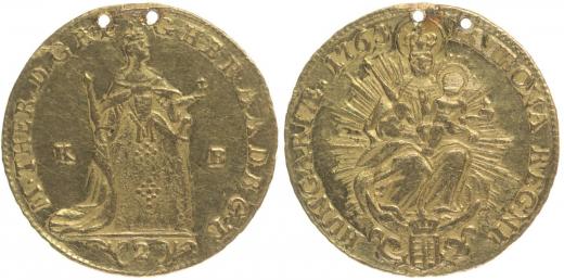 2 Dukát 1765 KB, N.70_dvě dírky po korunce