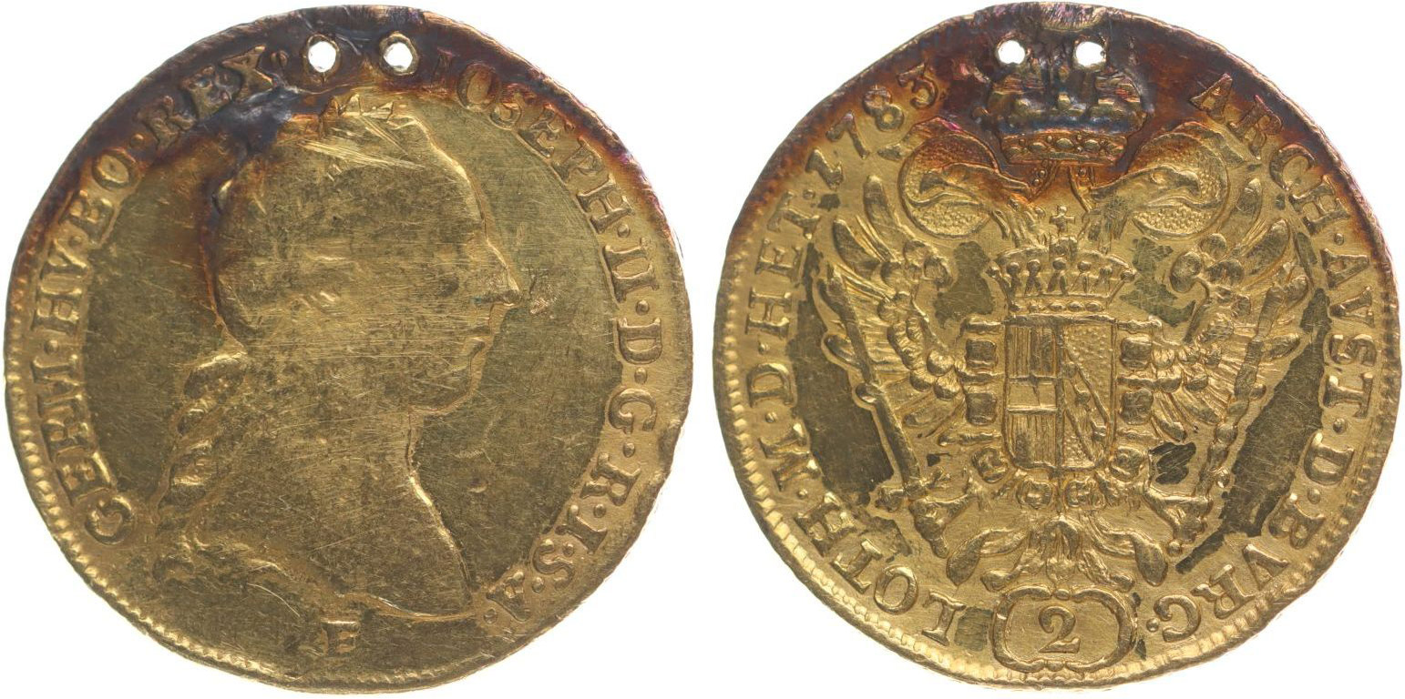 2 Dukát 1783 E, Karlovský Bělehrad, P.17_dvě dírky po korunce