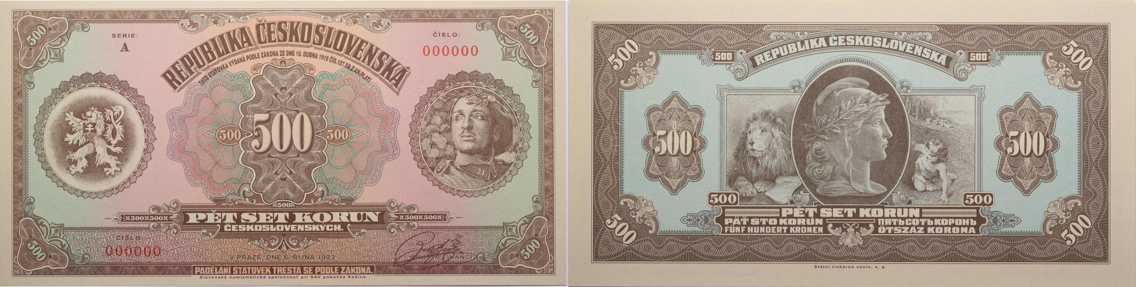 Pamětní novotisk 500 Kč 1923/2023, hnědý legionář, sér.A č.000000 - anulát, vydala SNS pob.Košice ve spolupráci s ČNB_v papír.etui