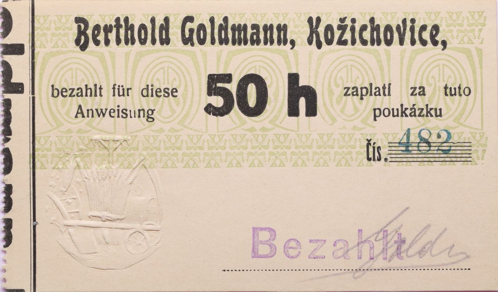 Kožichovice Berthold Goldmann 50 h 9-12/1914, č.482, bez kuponu DH.103.1.1c