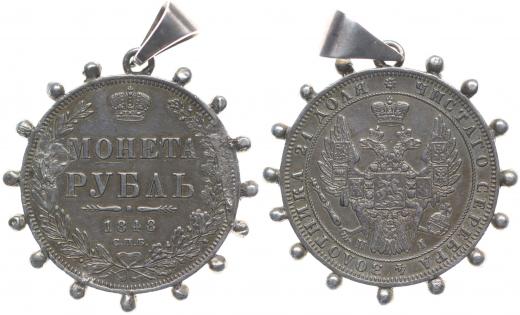 Rubl 1848 SPB-NI, Sankt Petěrburg, Cr.168.1, Uzd.1628 skup.XVIII-B/b _upravené jako šperk s ouškem se závěsem