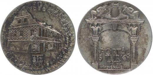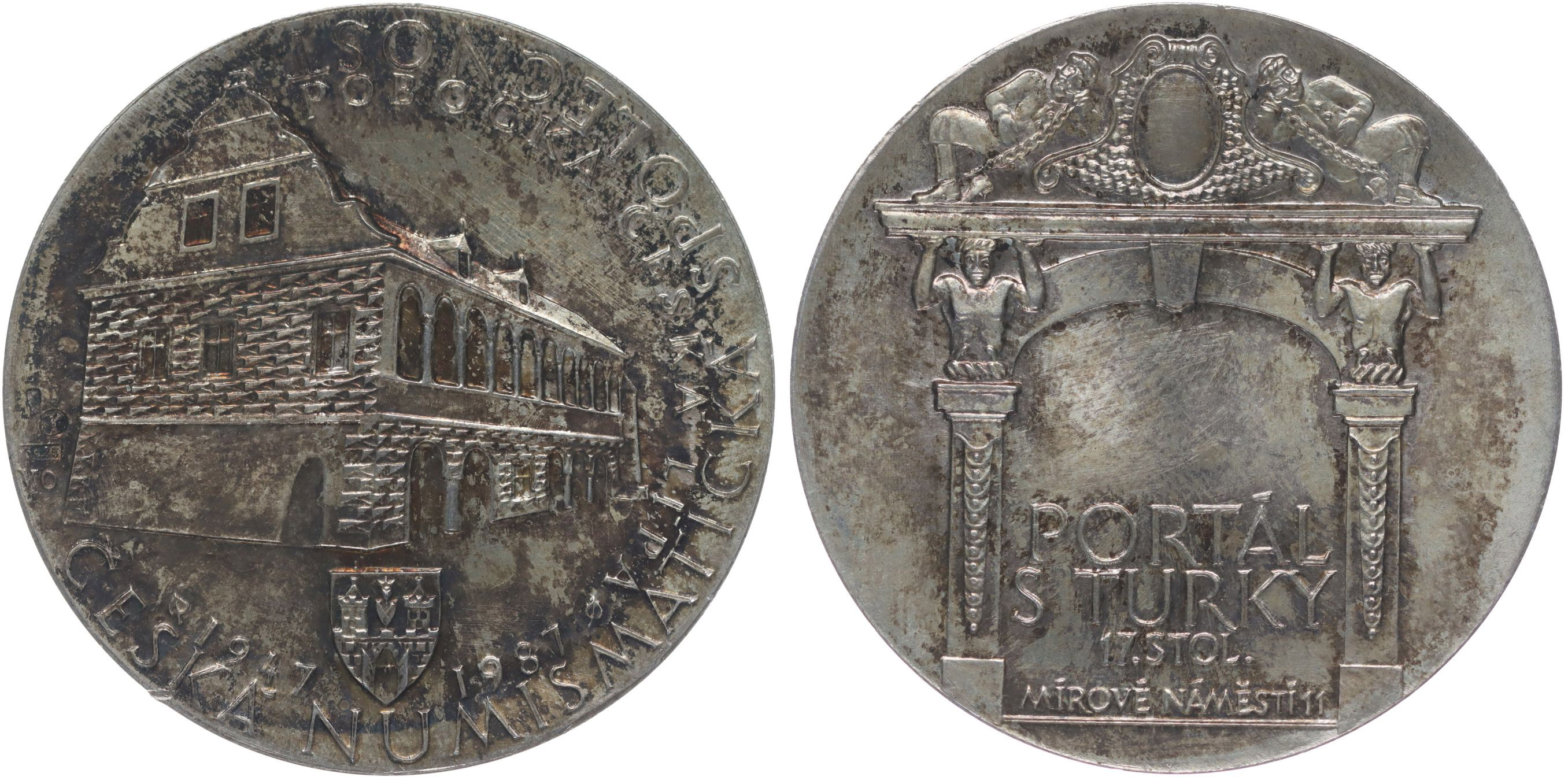 V.Oppl - 40 let pobočky, 1987#Ag Renesanční dům, znak, dvojitý opis / portál s Turky, nápis, Sign., Punc., Ag 42 mm, 35,4 g, náklad 115 ks, na hr. číslov. 56 BK.8/1A, MF.A4/1a
