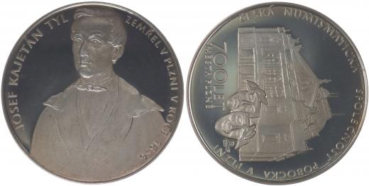 L.Kozák - 700 let Plzně - J.K.Tyl, 1991#Ag Poprsí mírně zleva, opis / divadlo, 2 divadelní masky písmo, Sign., Punc.900/1000, Ag 40 mm, 32,3 g, FM.A32/13a