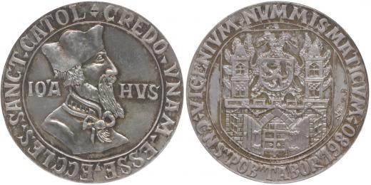 V.Vančura - 20 let organizované numismatiky, 1980#Ag Mistr Jan Hus zprava, nápis a opis /znak Tábora, opis Sign., Punc., Ag 900/1000, 42 mm, 28,95 g, BK.37/2, MF.A35/2a