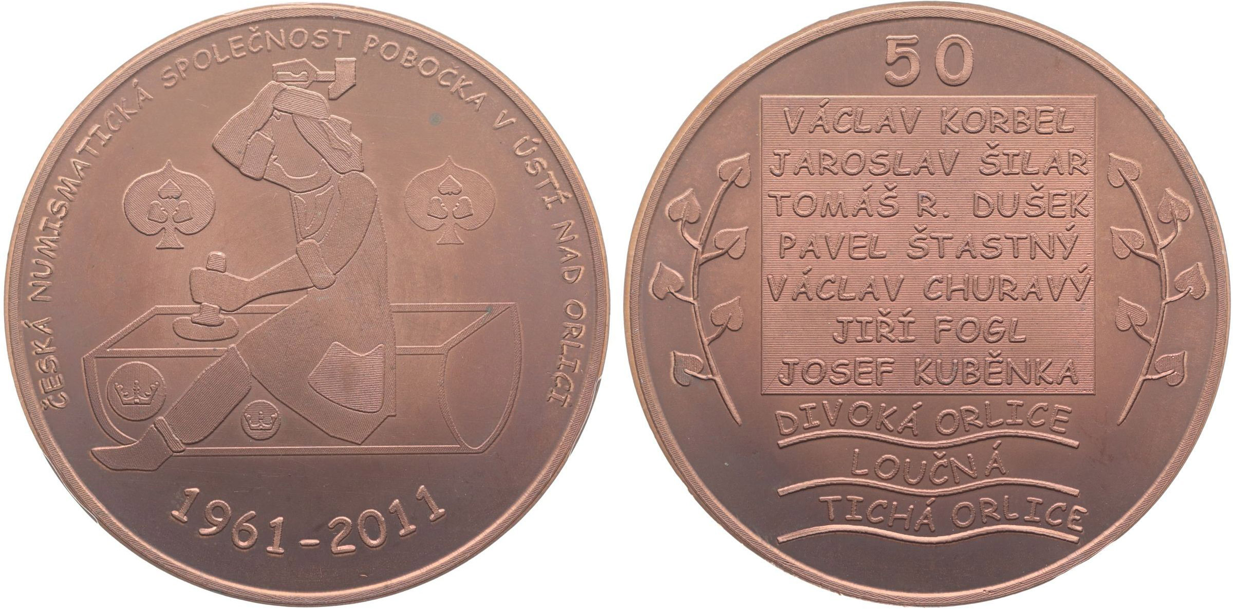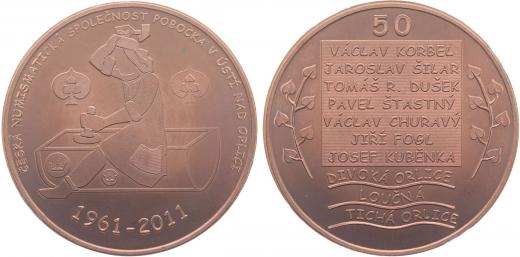 V.Mareš - medaile k 50.výročí pobočky 1961 - 2011 Sedící pregéř zleva, opis / ve čtverci jména předsedů pobočky Sign., Cu 50,5 mm, 89 g, náklad 3 ks, MF.A41/14c_RR!