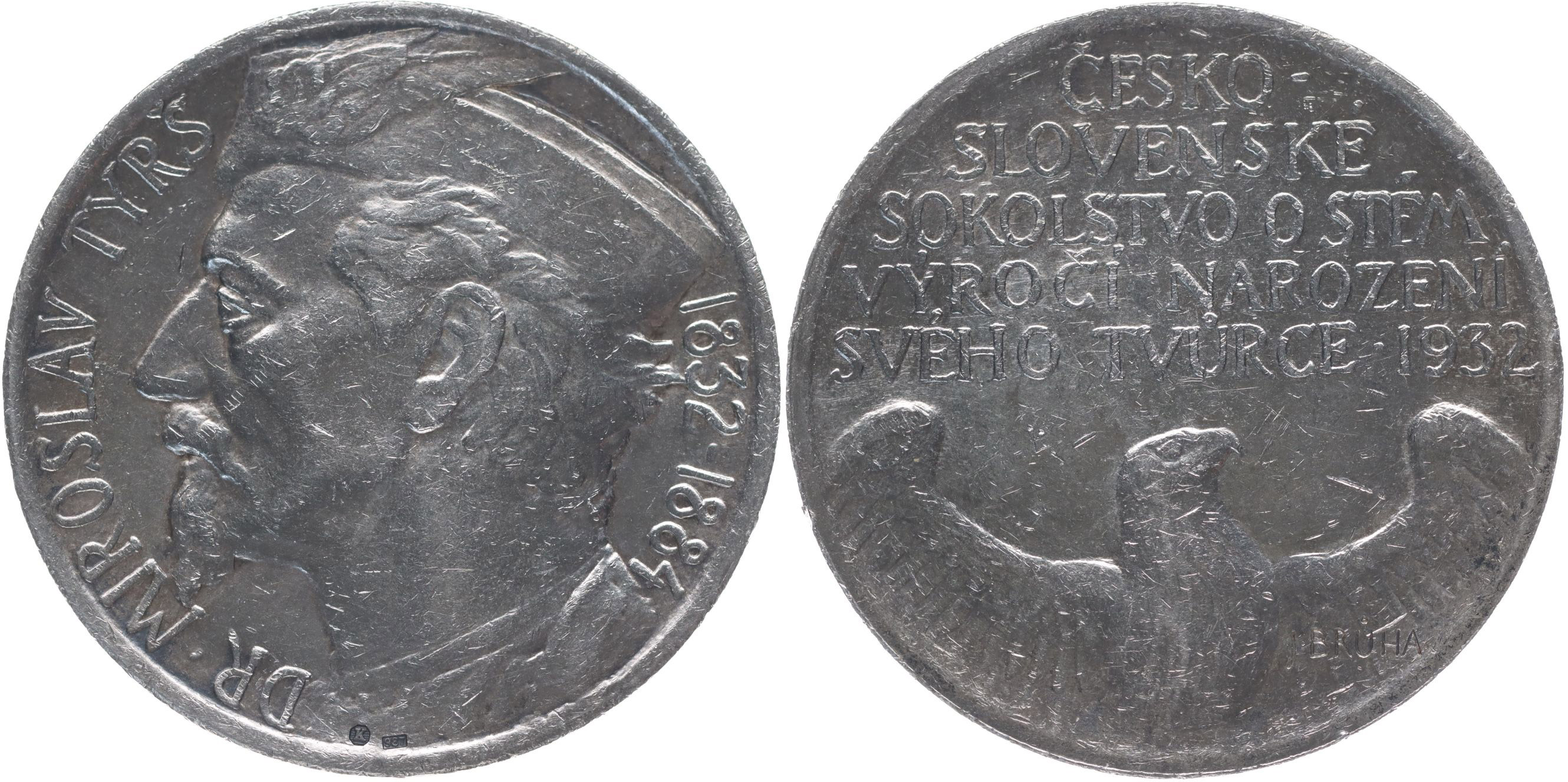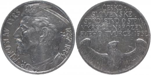ČOS - 100.výročí narození Dr.Miroslava Tyrše, 1932#Ag Portrét v sokolské čapce zleva, opis / sokol, nápis, Sign., Punc. 987, Ag 42 mm, 30.14 g_dr.rysky
